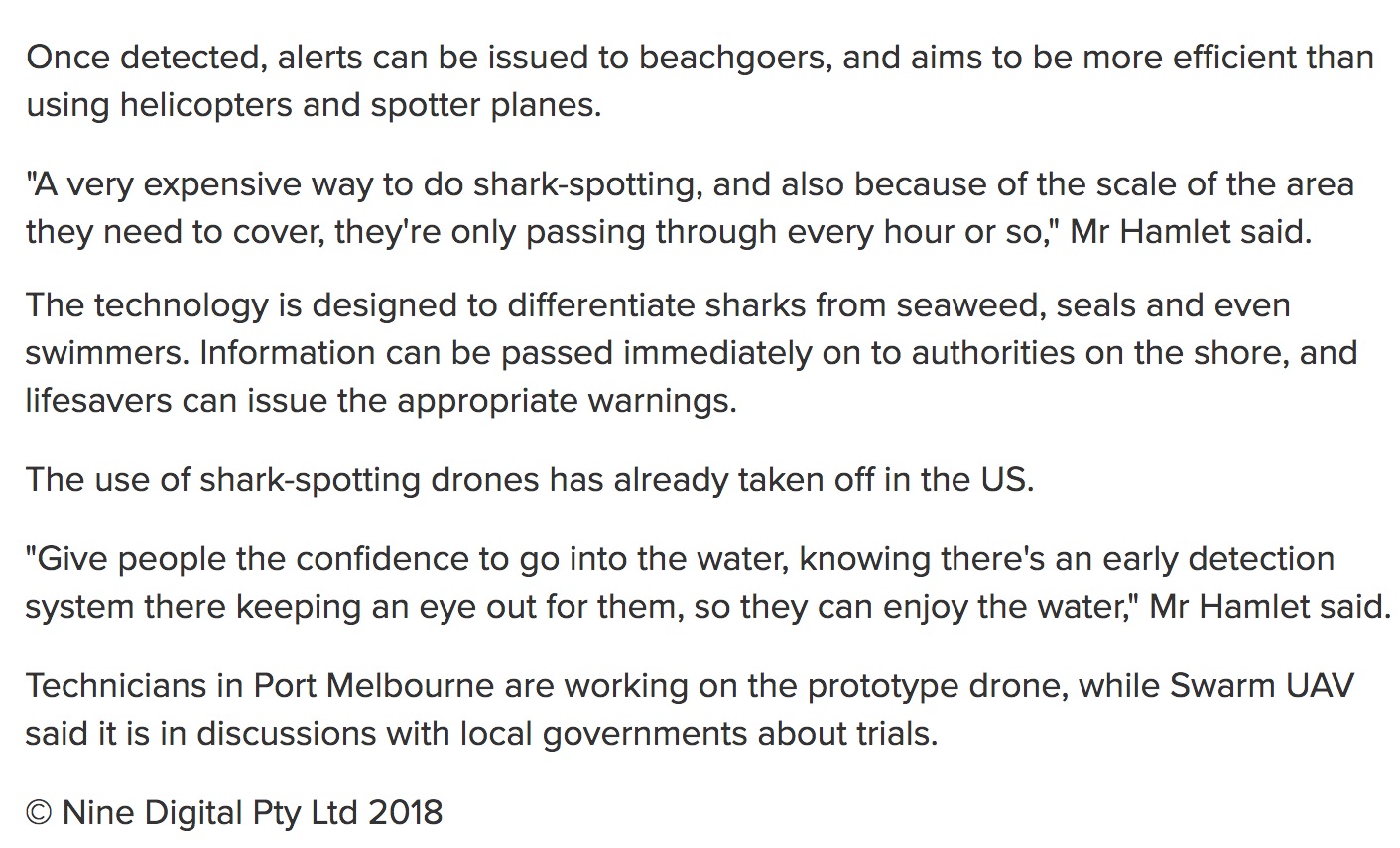 Home-grown company hopes to use drones to monitor sharks’, 30th November 2015, by “9-NEWS”, Video Interview of Vic Grosjean, Manager at Swarm Group – R&D lab.