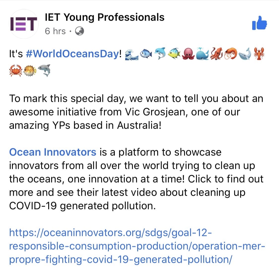 Vic Grosjean featured on the IET, RS Components, ESRAG and Impactr Newsletter for World Oceans Day