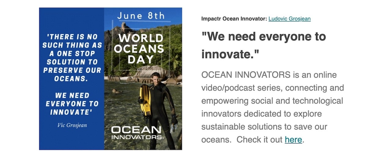 According to Vic Grosjean – “We need everyone to innovate.” OCEAN INNOVATORS is an online video/podcast series, connecting and empowering social and technological innovators dedicated to explore sustainable solutions to save our oceans.